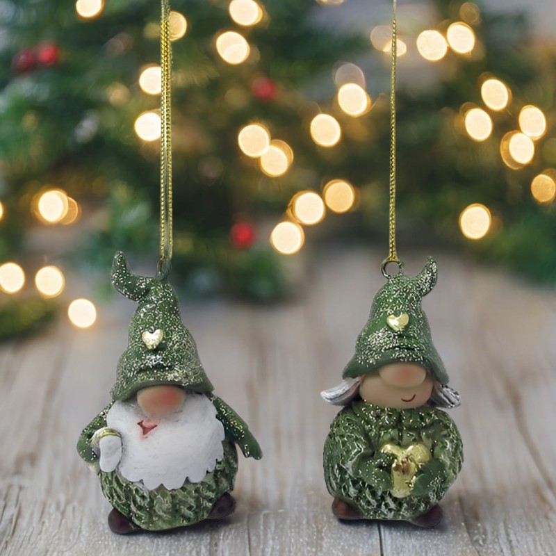 Aggiungi un tocco di dolcezza e simpatia al tuo albero di Natale con questi graziosi gnomi natalizi in resina. Caratterizzati da un vestito verde con cappelli verdi a punta decorati con un cuore oro, portano in mano piccoli doni e sfoggiano un design curato e accattivante.