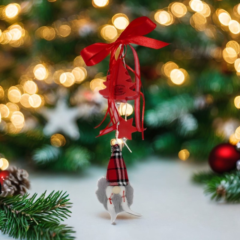 Elegante e vivace ghirlanda natalizia in sapone artigianale profumata alla mora e muschio, pensata per decorare e profumare i tuoi ambienti con un tocco di festa. Composta da elementi in sapone a forma di albero di Natale e un gnomo in tessuto, arricchita da raffinati nastri rossi in raso.