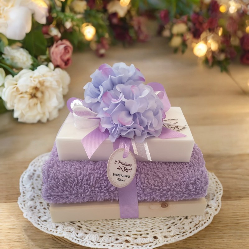 Confezione con portasapone, lavette lilla 30 x 30 cm in spugna e sapone muschio bianco da 100 grammi decorato con ortensia lilla