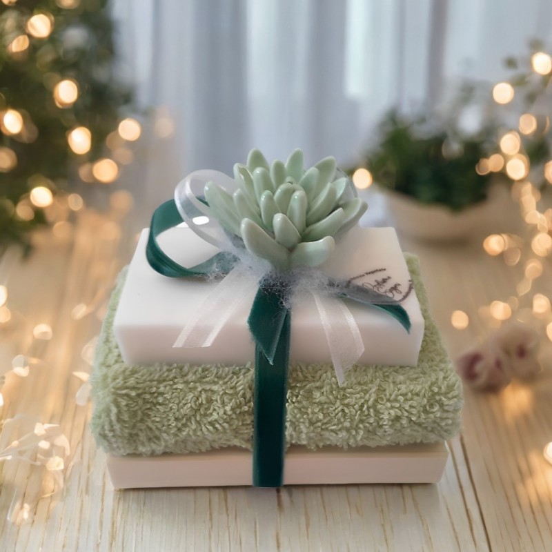 Confezione con portasapone, lavette verde 30 x 30 cm in spugna e sapone al muschio bianco da 100 grammi decorato con fiore in porcellana