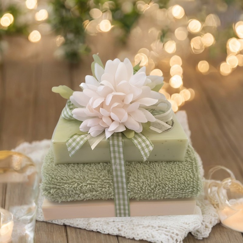 Confezione con portasapone, lavette verde 30 x 30 cm in spugna e sapone alla verbena da 100 grammi decorato con fiore artificiale