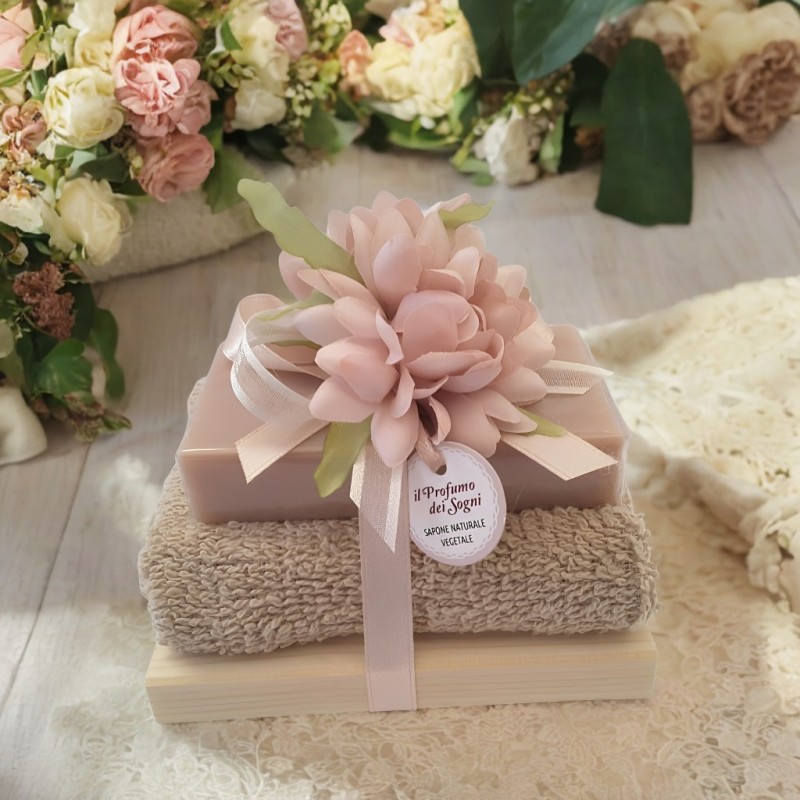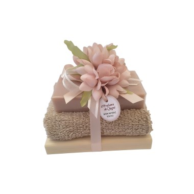 Confezione con portasapone, lavette beige 30 x 30 cm in spugna e sapone al talco da 100 grammi decorato con fiore artificiale
