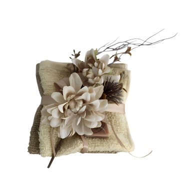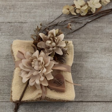 Coppia di asciugamani avorio e tortora 30 x 30 con fiori decorativi e saponetta a cuore profumata al talco