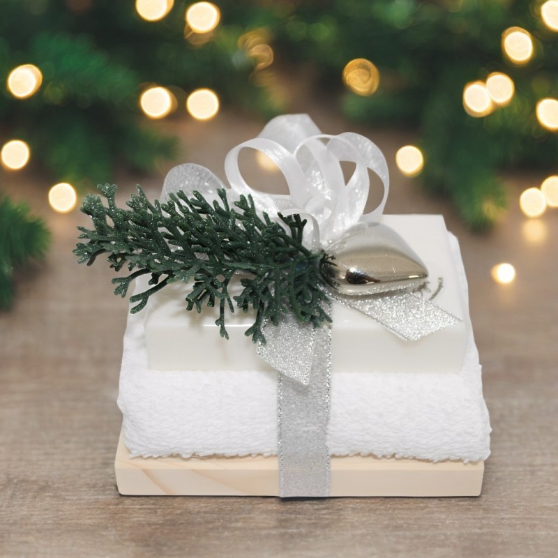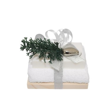 Raffinato e delicato, questo set è composto da una base in legno naturale, su cui poggiano un morbido asciugamano bianco e un elegante sapone profumato al muschio bianco, decorato con nastro argentato, cuore in metallo silver e rametto di pino artificiale.