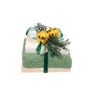 Confezione con portasapone, lavette 30 x 30 cm in spugna e sapone muschio bianco da 100 grammi decorato con sonaglio e pino artificiale.