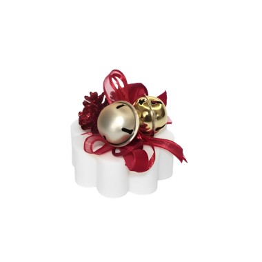 Sapone fiore bianco fragranza muschio bianco decorato sonaglio oro con pigne glitterate rosse.