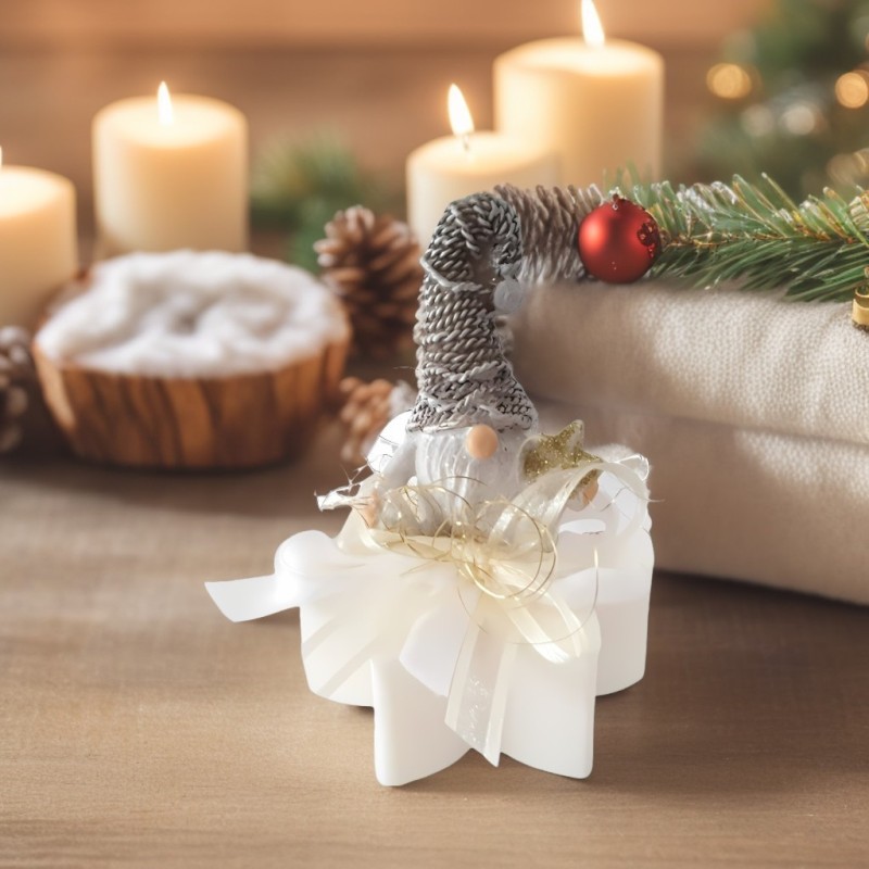 Porta l'eleganza e la magia del Natale nella tua casa con questo splendido sapone decorativo profumato al muschio bianco. Questo sapone è decorato con uno gnomo in resina e una stella scintillante oro, questo dettaglio lo rende ideale per arricchire le decorazioni natalizie della tua casa. Perfetto come idea regalo o come profumatore d'ambiente, aggiungerà un tocco raffinato e festoso a qualsiasi ambiente.