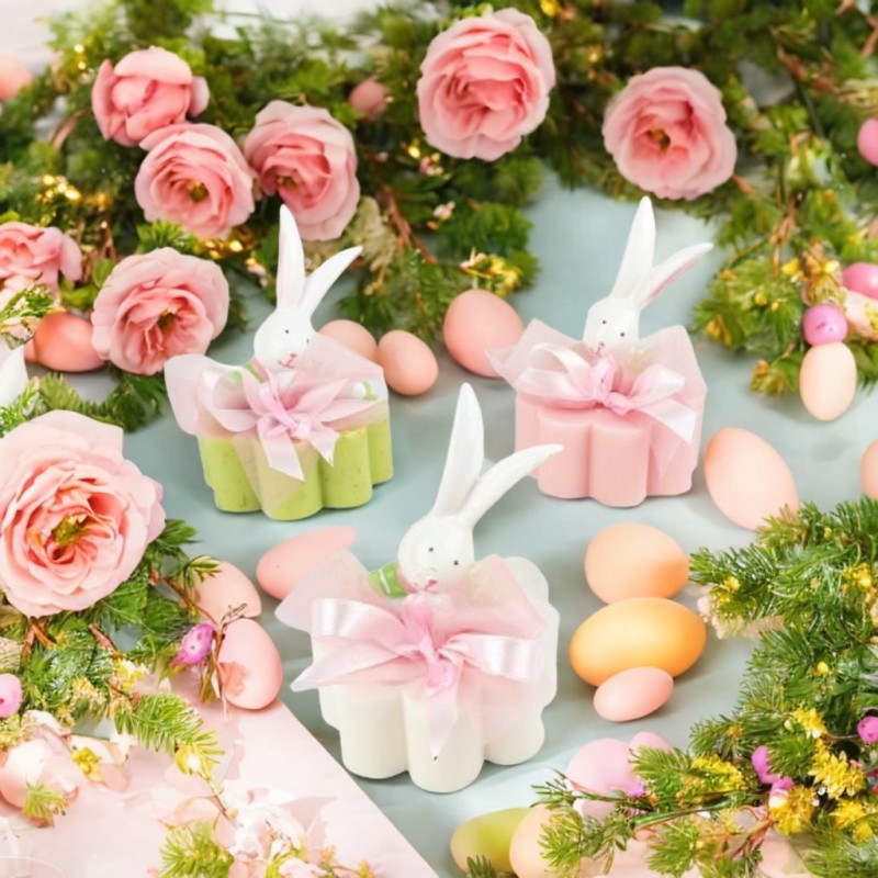 Le fragranze rendono ogni utilizzo un'esperienza unica, avvolgendo la pelle in note di freschezza, dolcezza e eleganza. Ogni sapone è impreziosito da un coniglio in resina, posto con grazia sulla sua superficie, trasformando i tuoi ambienti in uno spazio pasquale pieno di gioia.